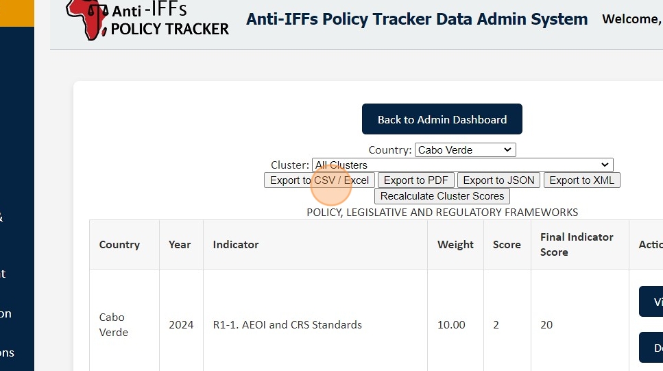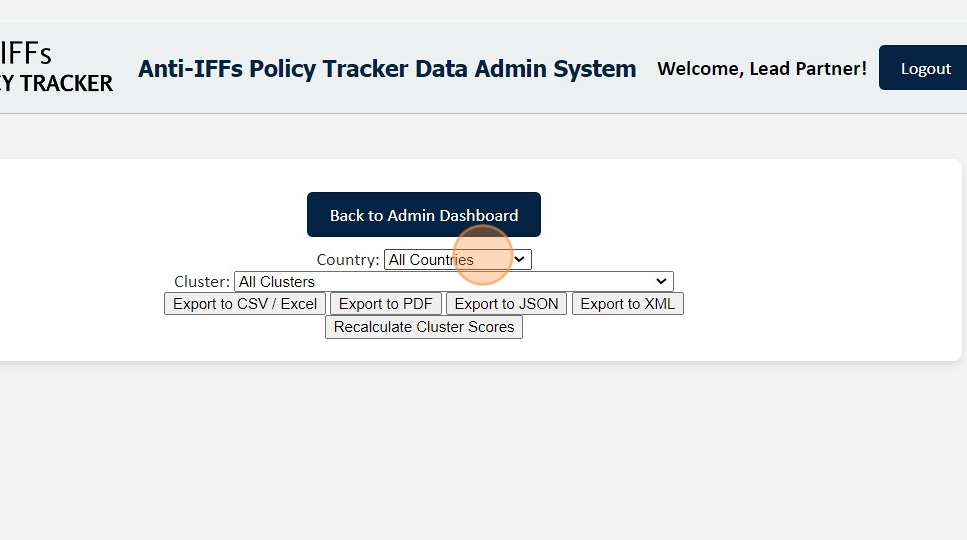 4. Select the desired data combinations to export, which can be filtered by options such as countries, clusters, and other relevant criteria.