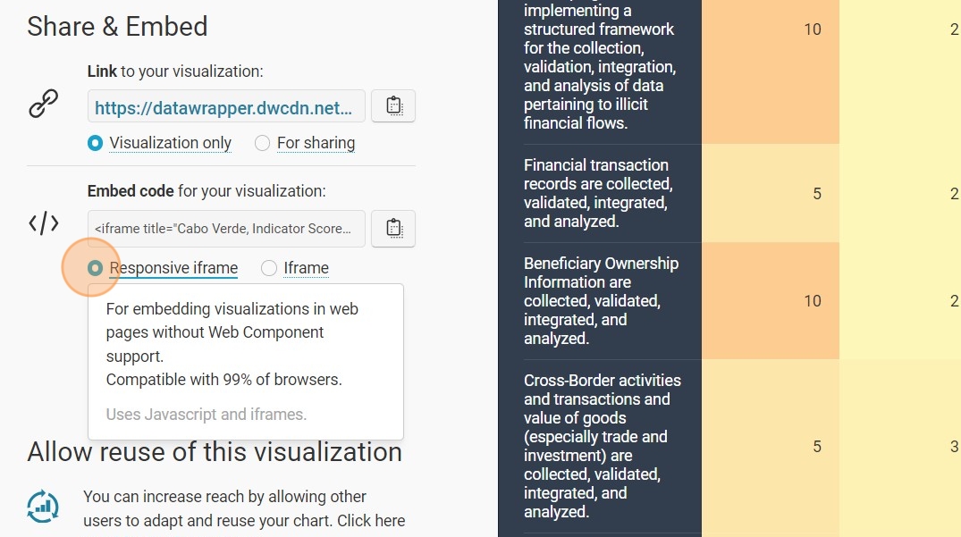 19. Once the visualization is published, go to the 'Share & Embed' section and select the 'iFrame' option. Copy the iFrame code and keep it for later use to display the visualization on your Joomla website.